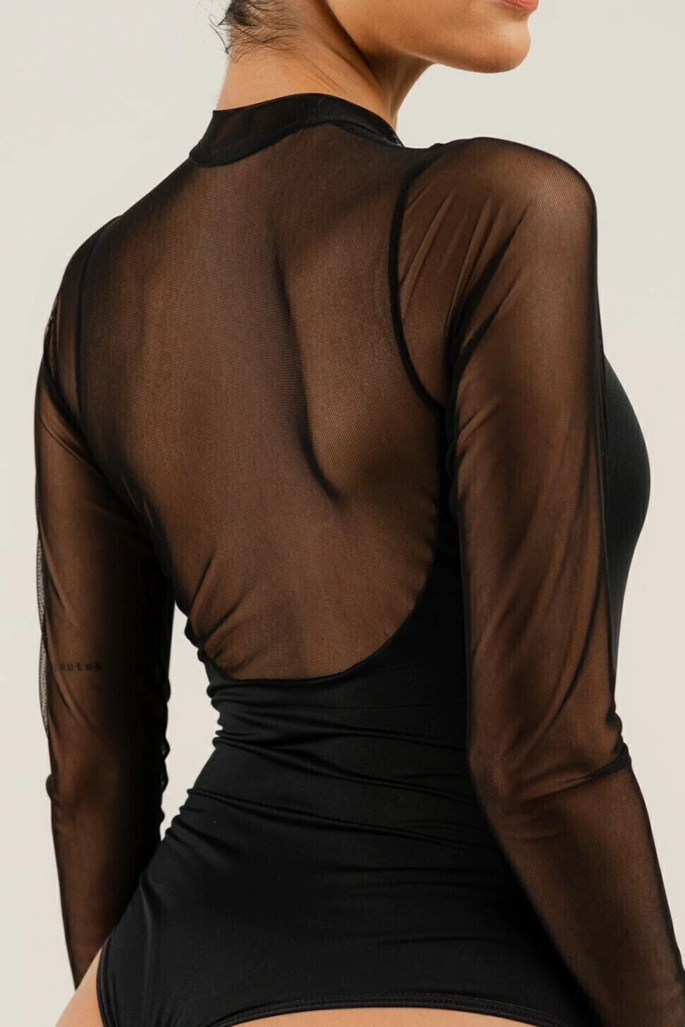 El body Luna Negra proyecta elegancia y sensualidad. Tiene transparencias en escote, hombros y espalda. Terminación roulotte en mangas, que le da un efecto de voladitos. Además, cuenta con gancho para su acceso en la parte baja y la tela es elastizada.