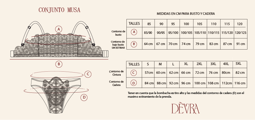 Para elegir el talle correcto, guíate por las medidas de la siguiente tabla, priorizando la medida del contorno de busto: